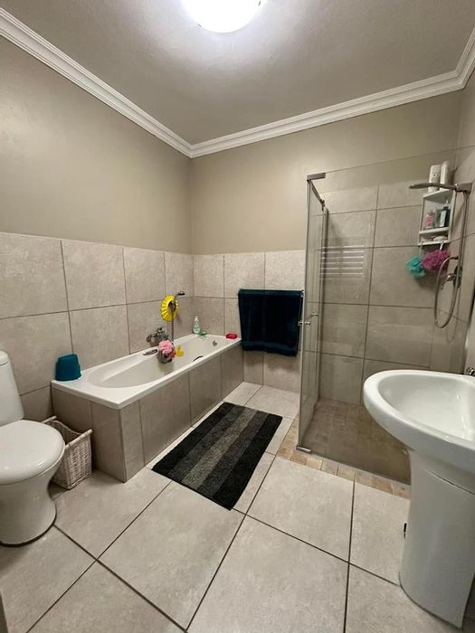Three-bedroom property with flat, garden, braai area, and single garage in Pionierspark. Contact Romy for viewing.