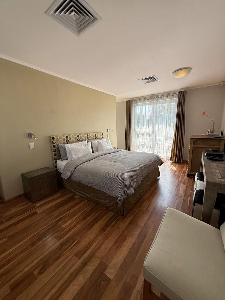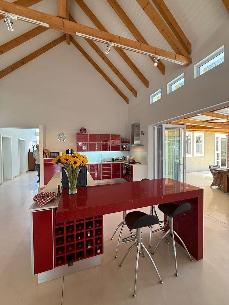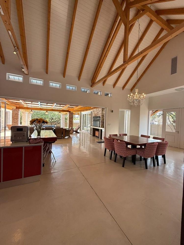 Presenting a modern suburban home built in a U-shape around a pristine pool, featuring a double-volume ceiling that reveals exposed wooden beams for a bold architectural statement. Designed to accommodate a large family and ideal for entertaining.
