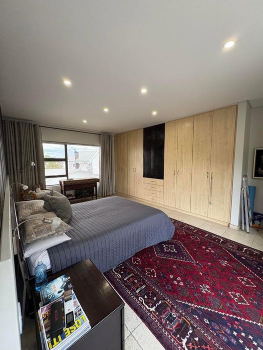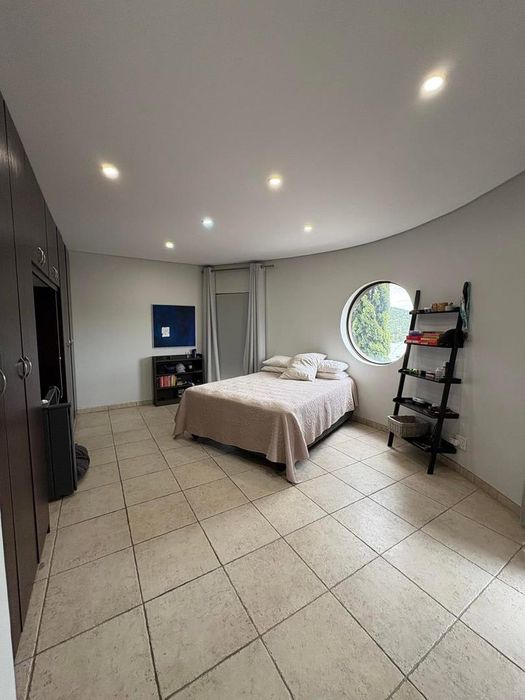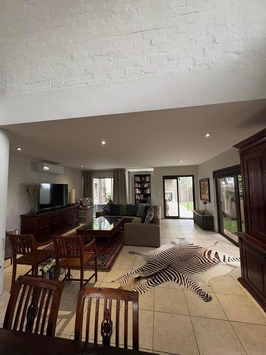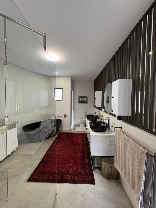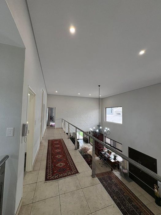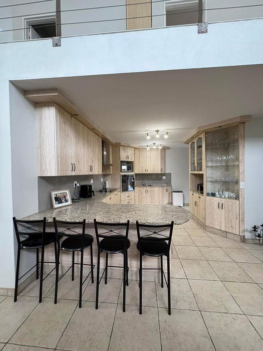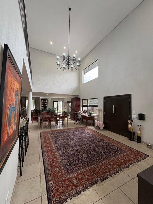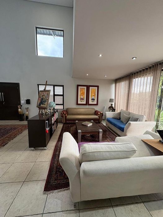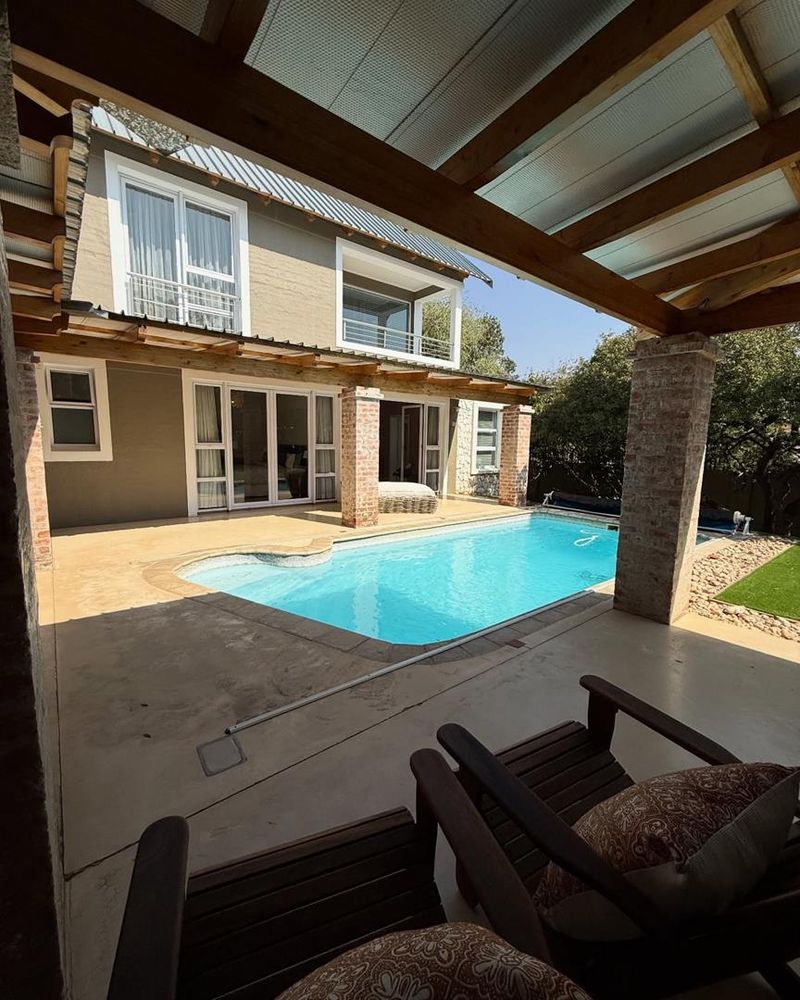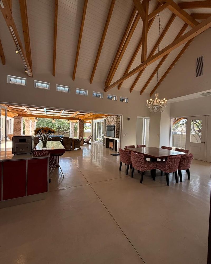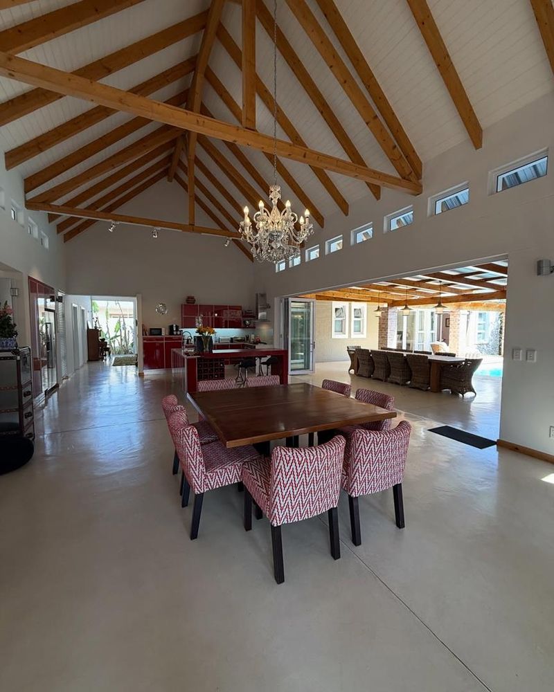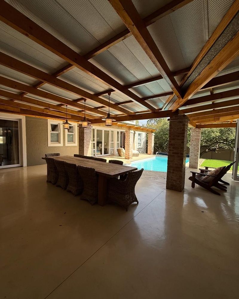 Presenting a modern suburban home built in a U-shape around a pristine pool, featuring a double-volume ceiling that reveals exposed wooden beams for a bold architectural statement. Designed to accommodate a large family and ideal for entertaining.