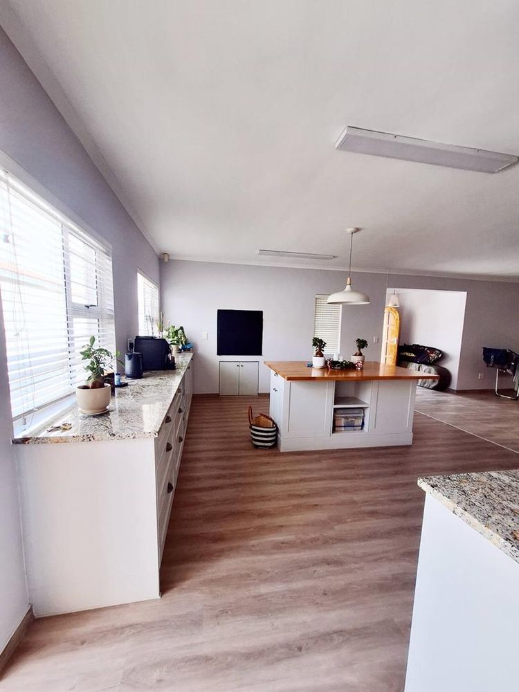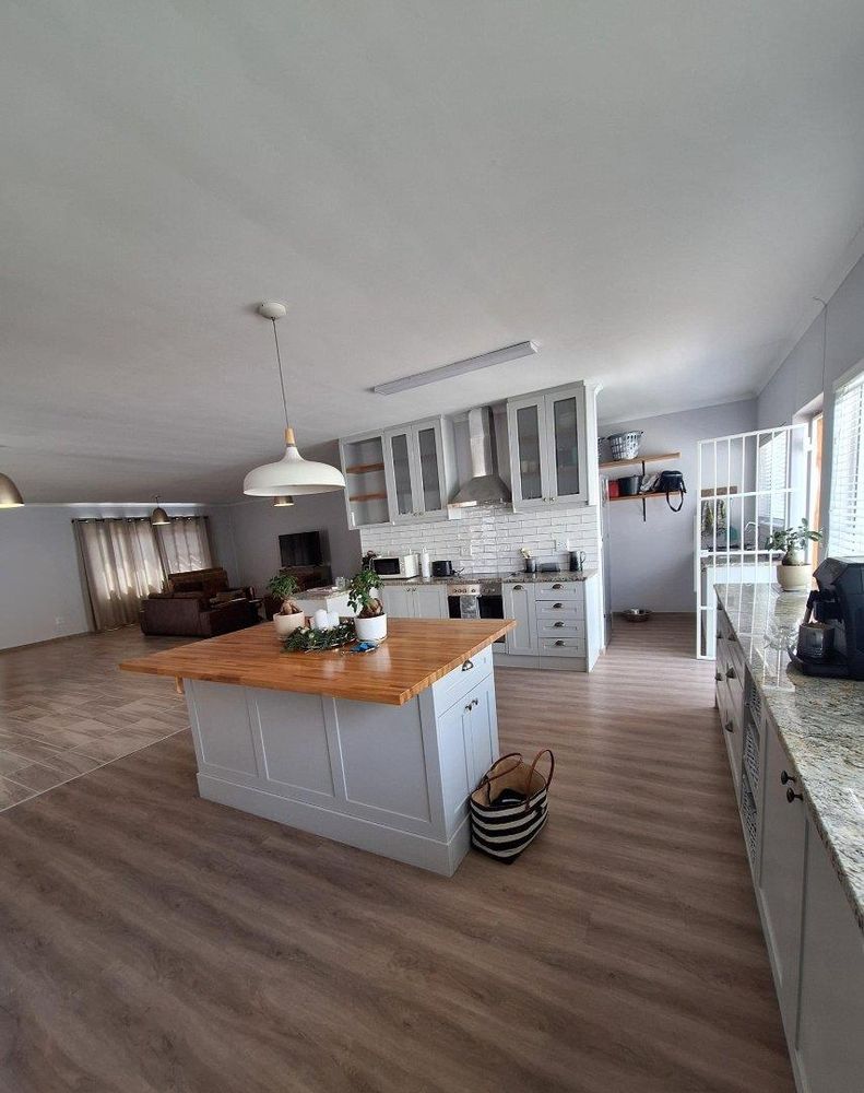 3 bedrooms , 2 bathrooms , open-plan living area with indoor braai and large open space in the kitchen/dining area. Kitchen has lots of bic and a big scullery.