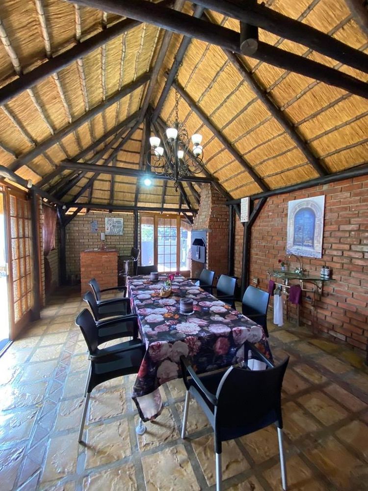 Enclosed entertainment area with thatched roofing and has a BBQ and smaller bar area.