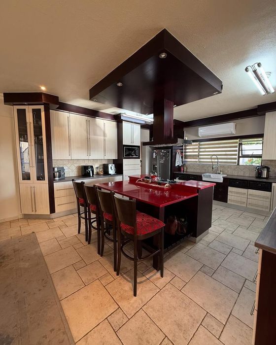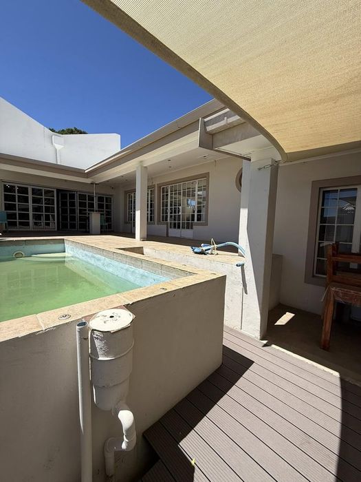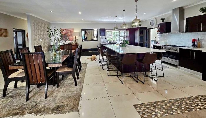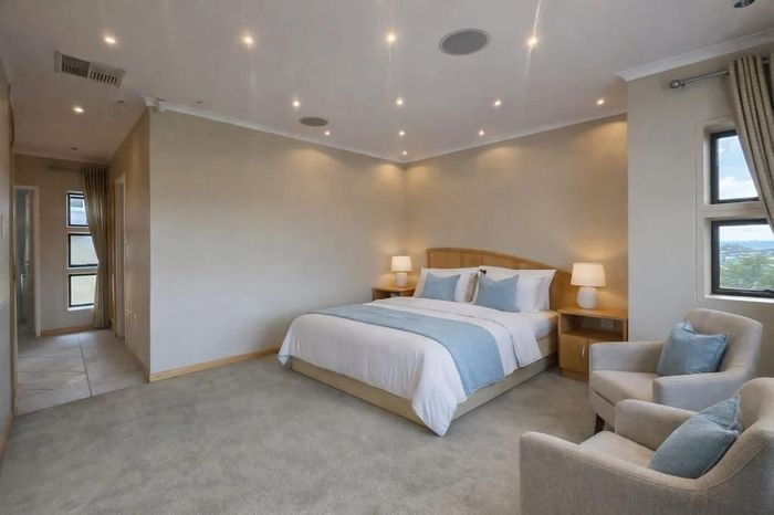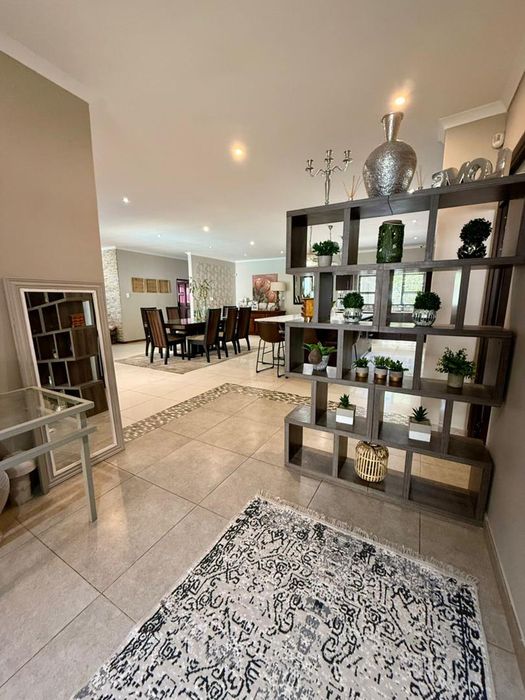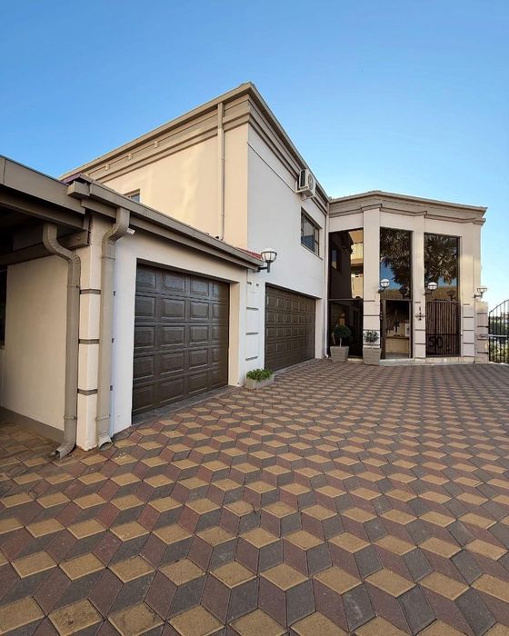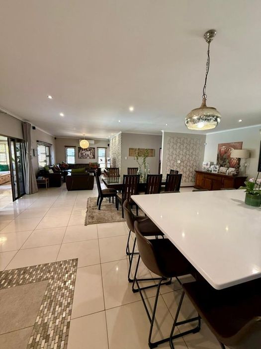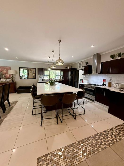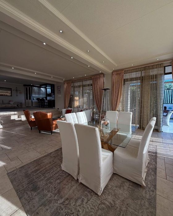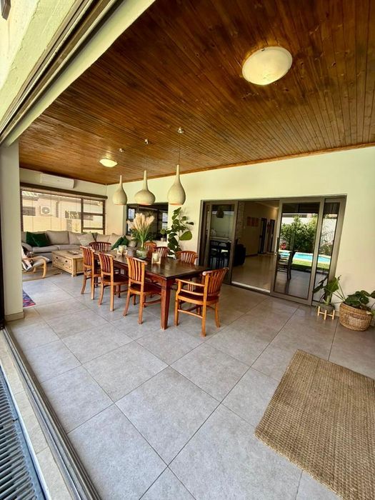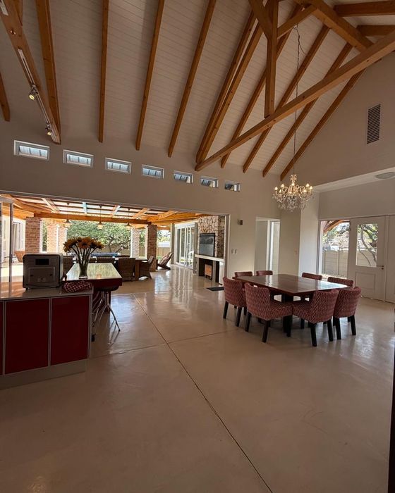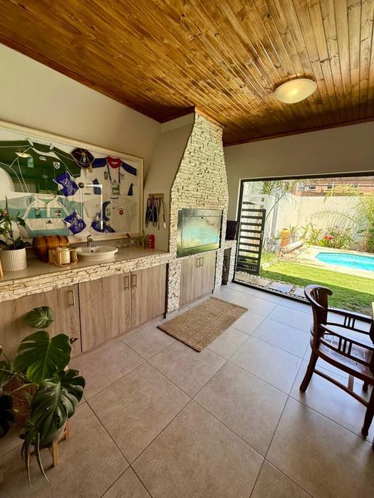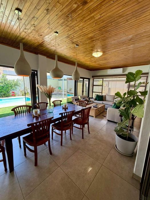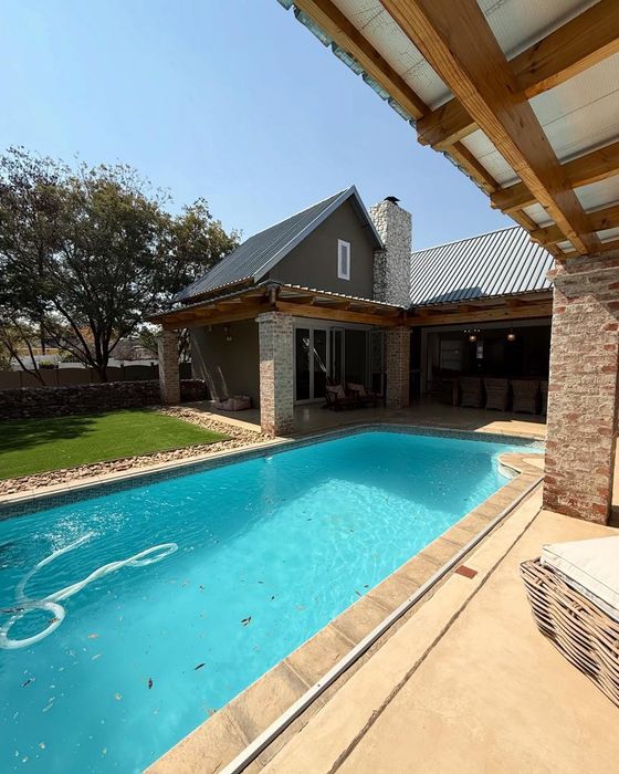 Entertainer's dream in Ludwigsdorf with pool-centered U-shape design and double-volume exposed-beam ceiling, expansive patio with built-in braai. Five en-suite bedrooms, media room, double garage.