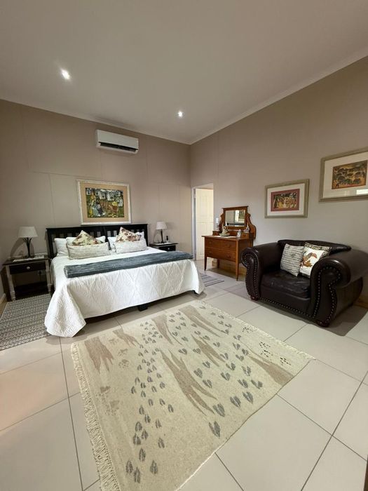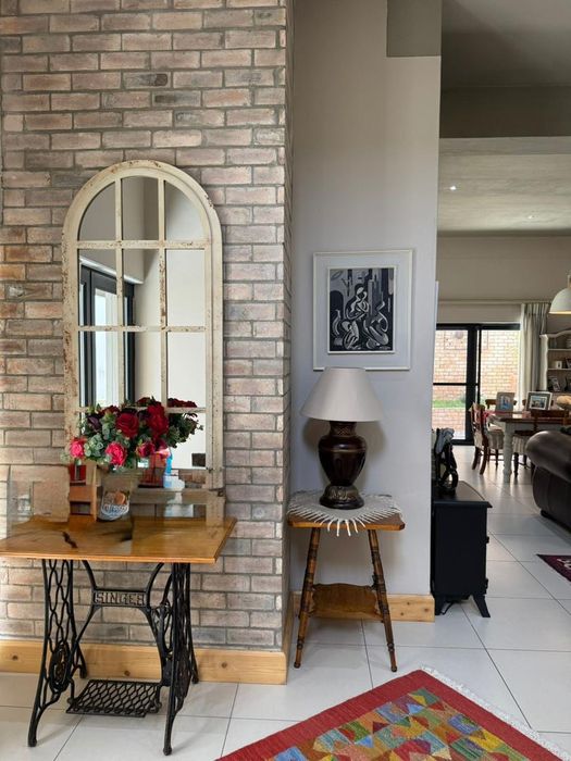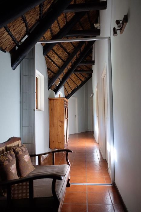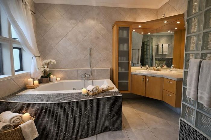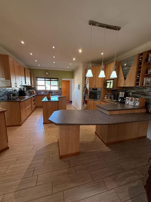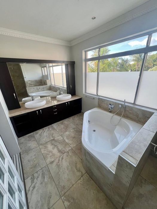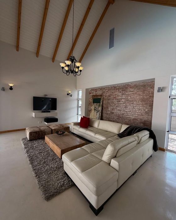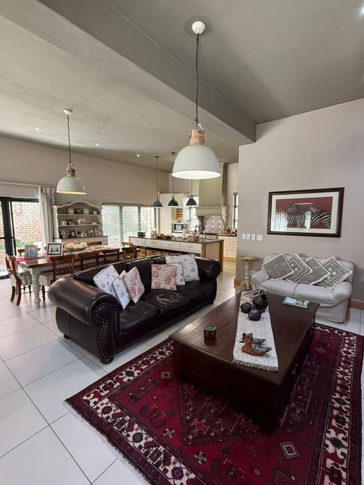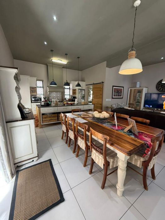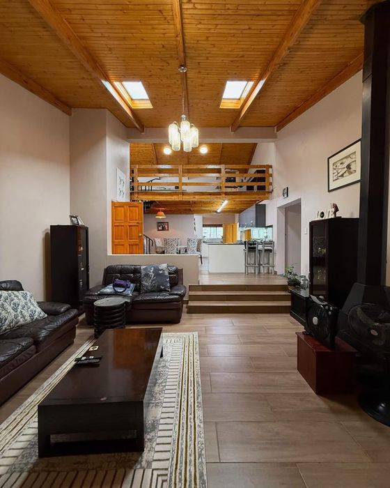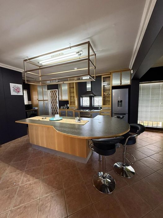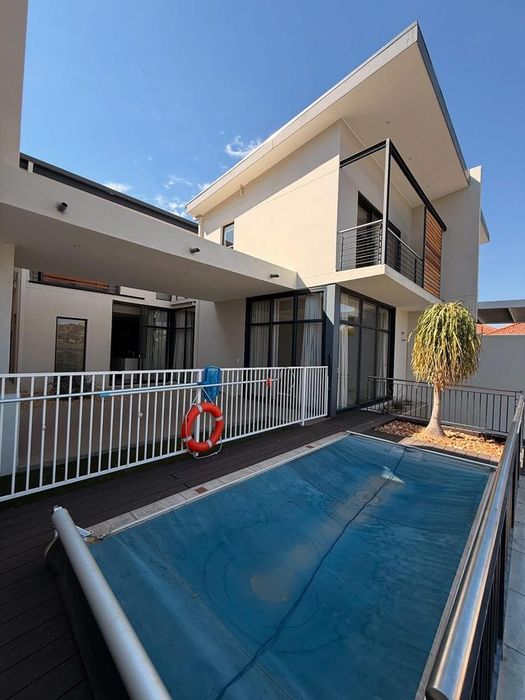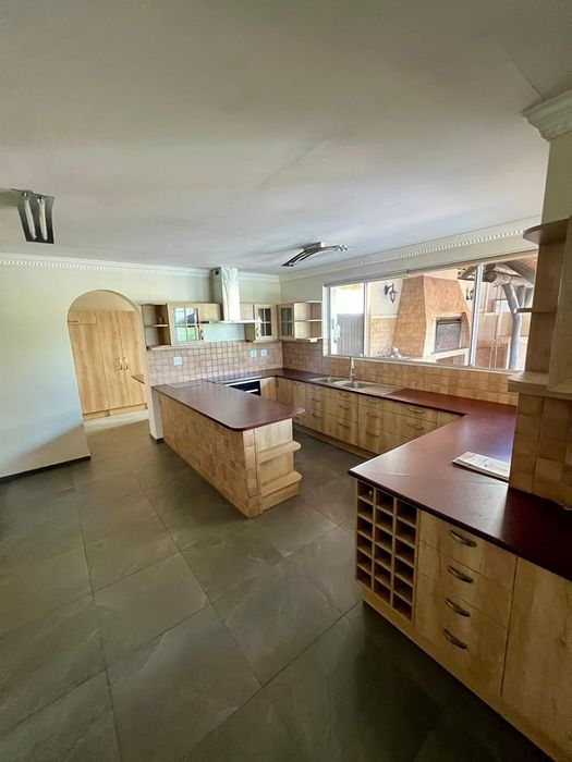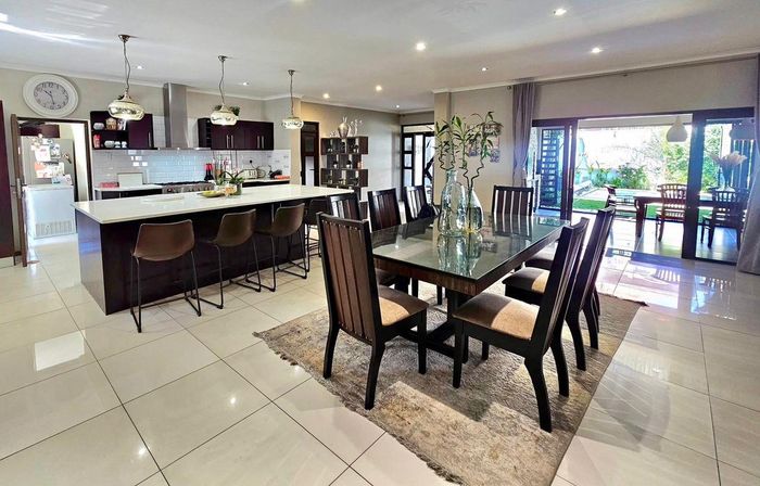 Entertainer's dream in Ludwigsdorf with pool-centered U-shape design and double-volume exposed-beam ceiling, expansive patio with built-in braai. Five en-suite bedrooms, media room, double garage.