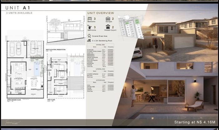 3 bedrooms, 3 bathrooms, indoor pool, single garage, double carport, 258 sqm under roof on 831 sqm plot. N$3,250,000.