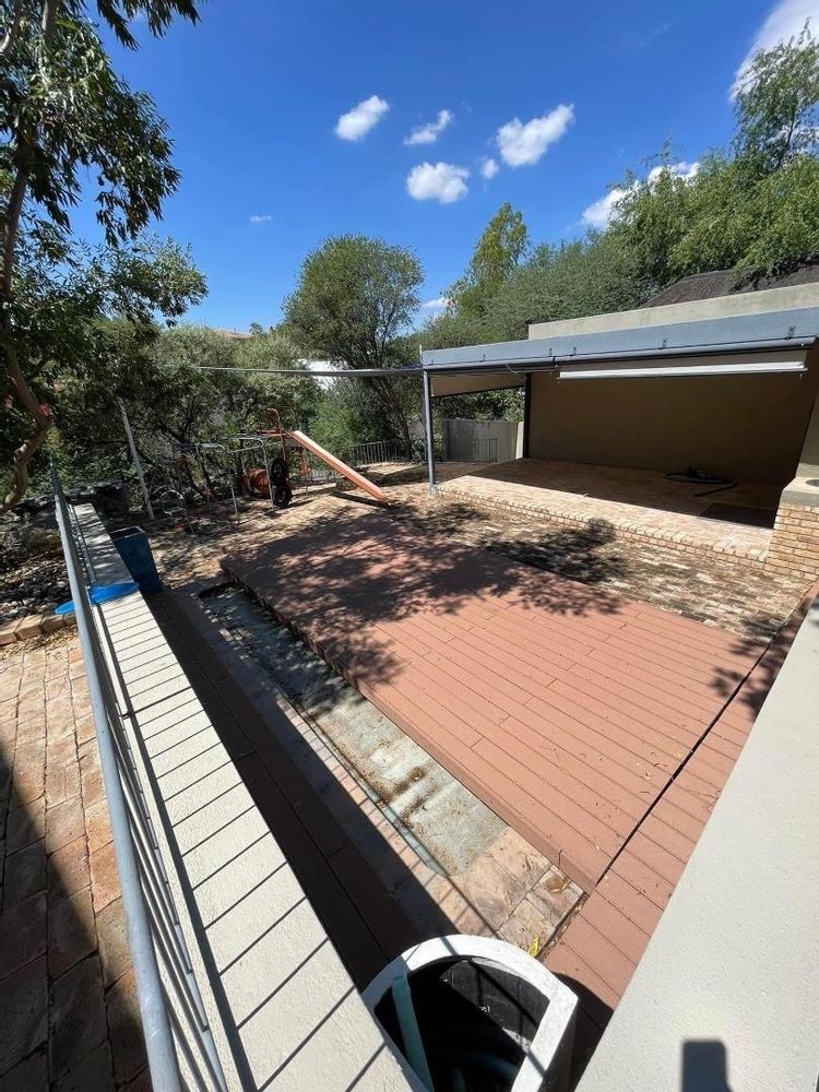 Under the trees is a great covered entertainment patio with fitted BBQ and awnings next to a sparkling heated pool with wooden sliding deck.