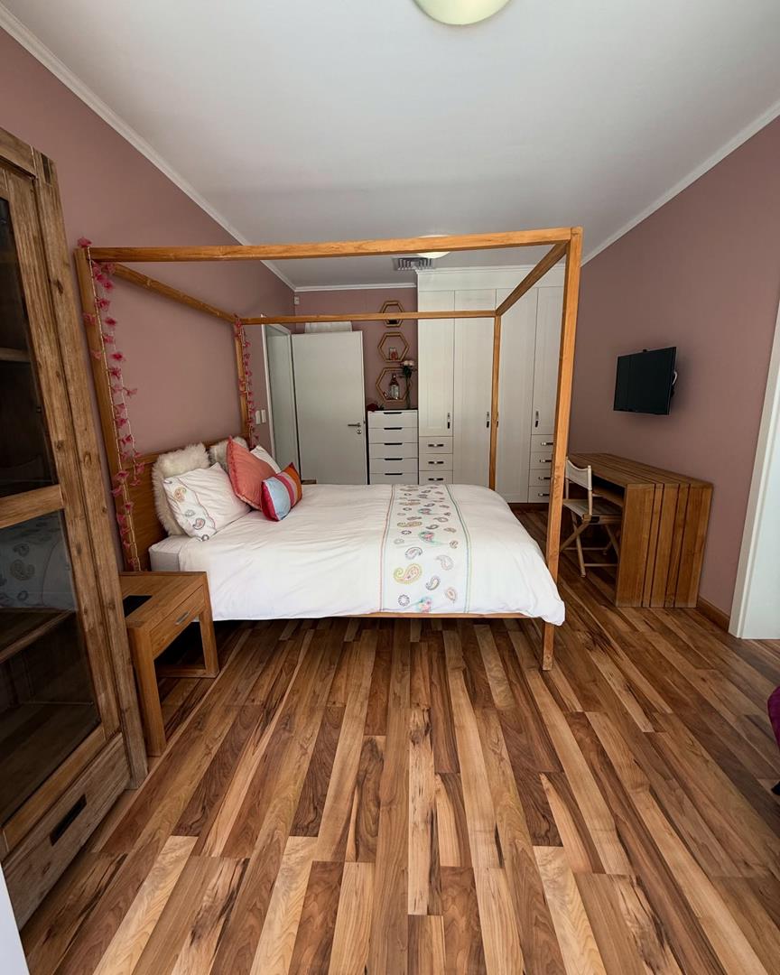 Presenting a modern suburban home built in a U-shape around a pristine pool, featuring a double-volume ceiling that reveals exposed wooden beams for a bold architectural statement. Designed to accommodate a large family and ideal for entertaining.