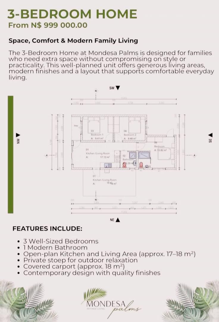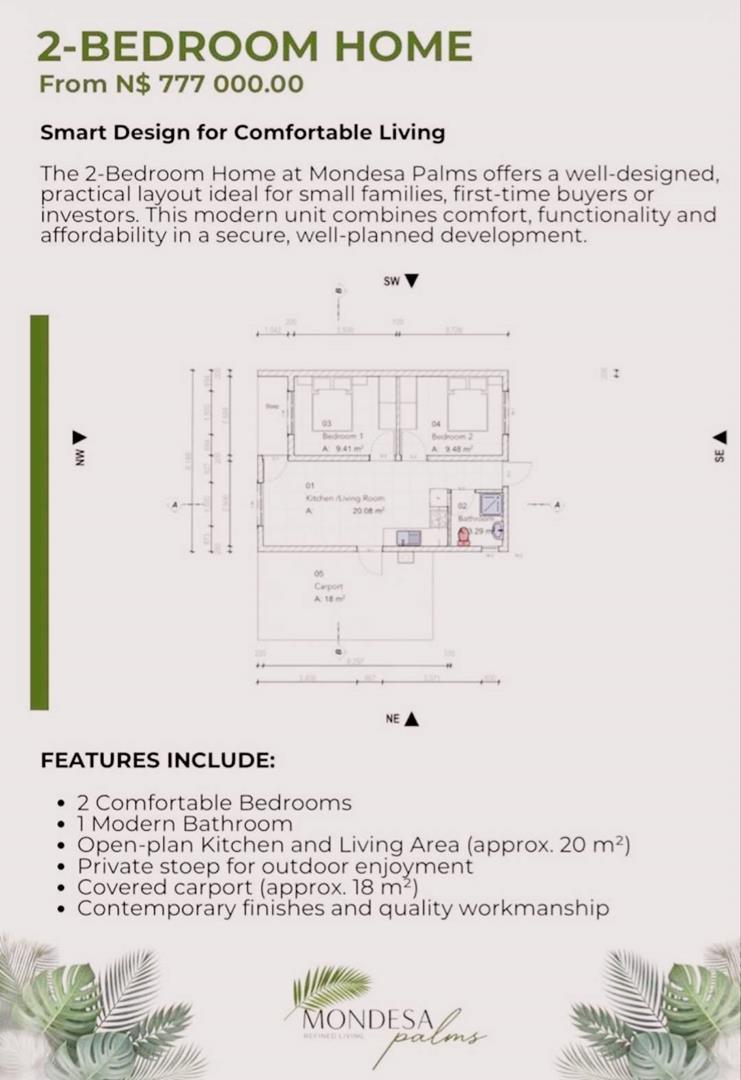 Mondesa Palms is an exciting, newly launched residential development in the heart of Mondesa. It is specifically designed to provide a secure and serene community environment that bridges the gap between high-end contemporary aesthetics and accessible pricing.